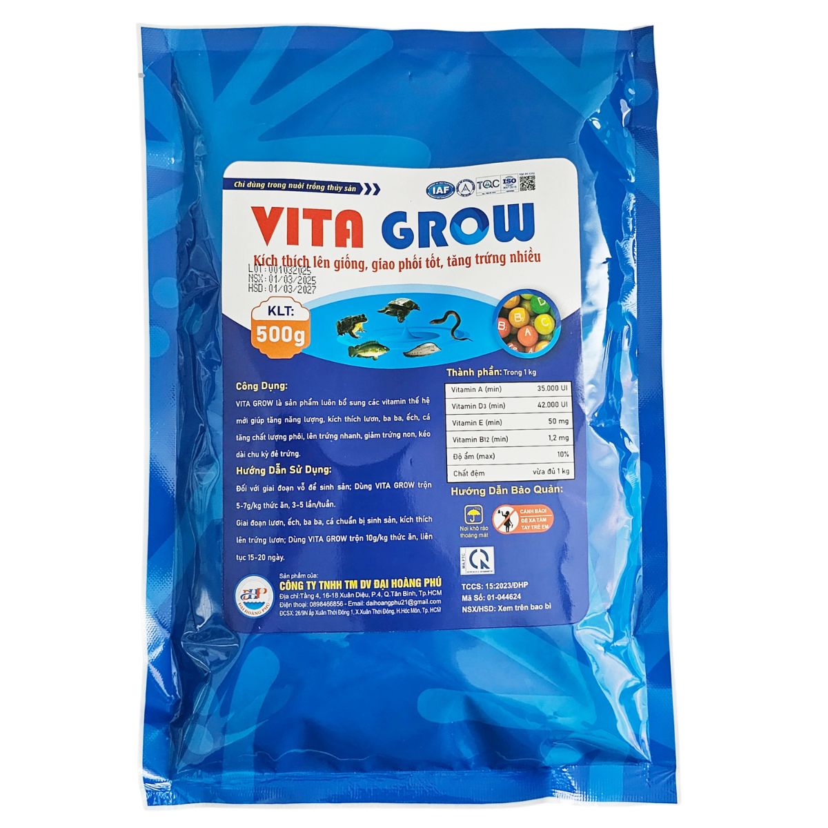 - VITA GROW là sản phẩm giúp bổ sung vitamin thế hệ mới giúp tăng năng lượng, kích thích lươn, baba, ếch, cá tăng chất lượng phôi, lên trứng nhanh, giảm trứng non, kéo dài chu kỳ đẻ trứng